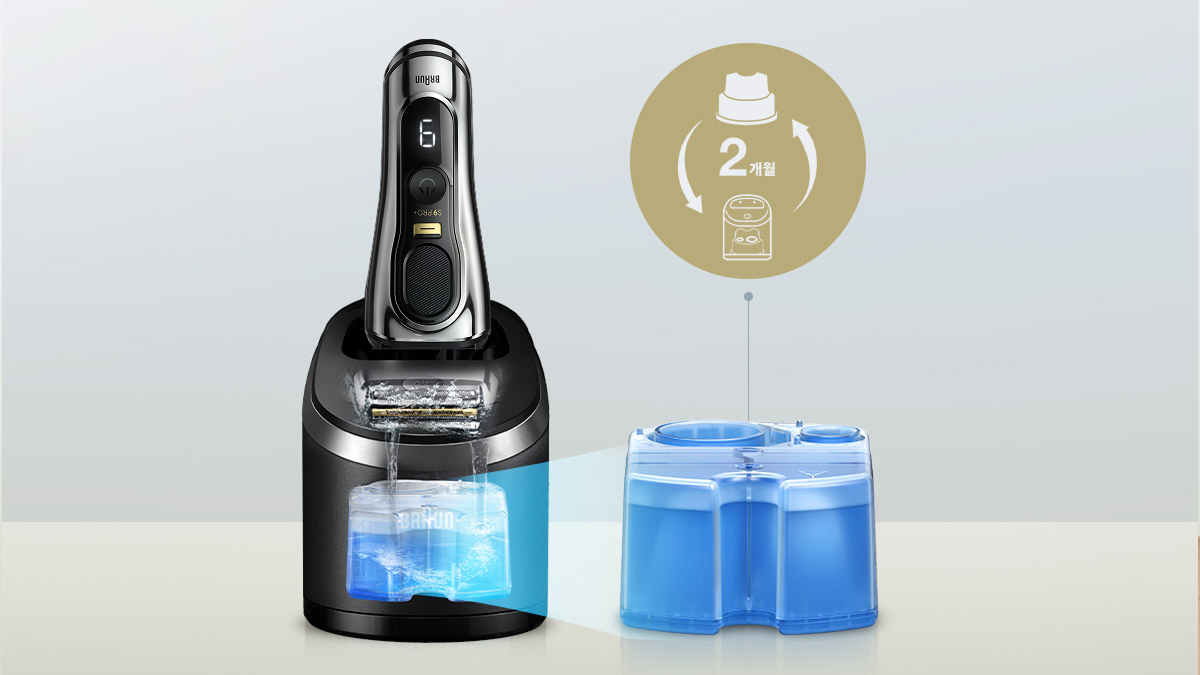 위생적인 면도기 관리를 위해 세척&충전 스테이션의 세정액 교체를 권장합니다.