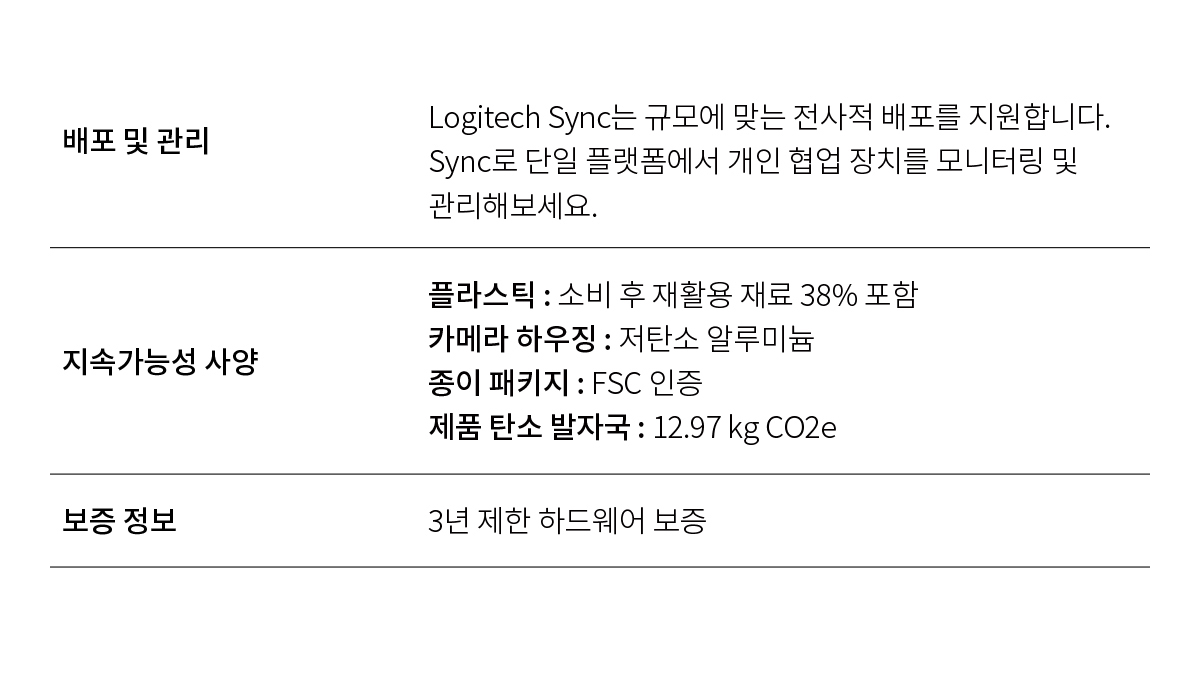 | 구성 | 웹캠, 탈착식 장착 클립, 프라이버시 셔터, USB-A to USB-C 케이블, 사용 설명서 |