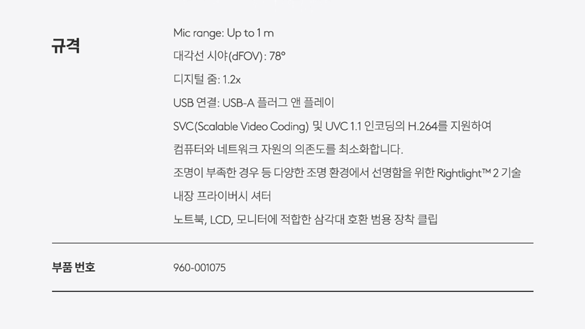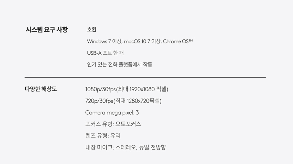 | 구성 | 1.83m 기본 USB-A 케이블이 부착된 웹캠, 탈착식 장착 클립, 프라이버시 셔터, 사용 설명서 |