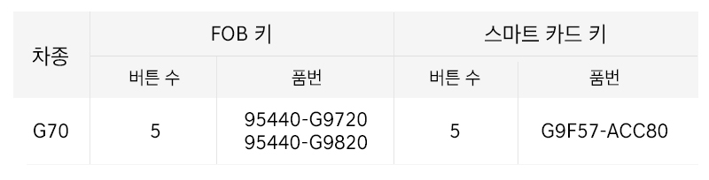 - 반드시 기존 스마트 키(FOB 키) 부품 번호가 맞는지 확인하신 후 구입하시기 바랍니다.