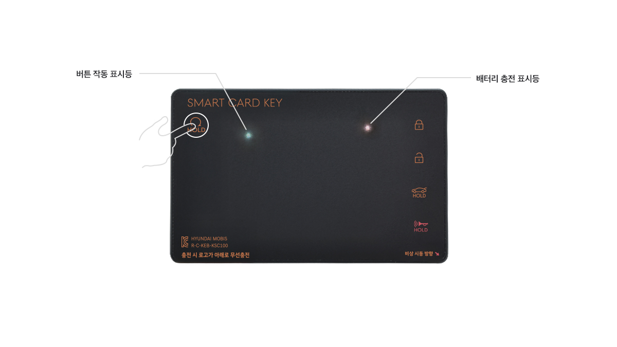 기존 스마트 키 기능을 그대로 사용할 수 있는 버튼형 스마트 카드 키로, 신용카드와 동일한 사이즈에 2.5mm의 얇은 두께로 제작하여 휴대성과 효율성을 극대화한 제품입니다.