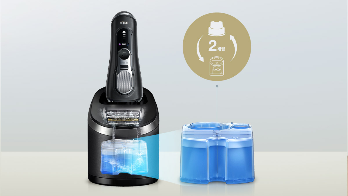 위생적인 면도기 관리를 위해 세척&충전 스테이션의 세정액 교체 권장