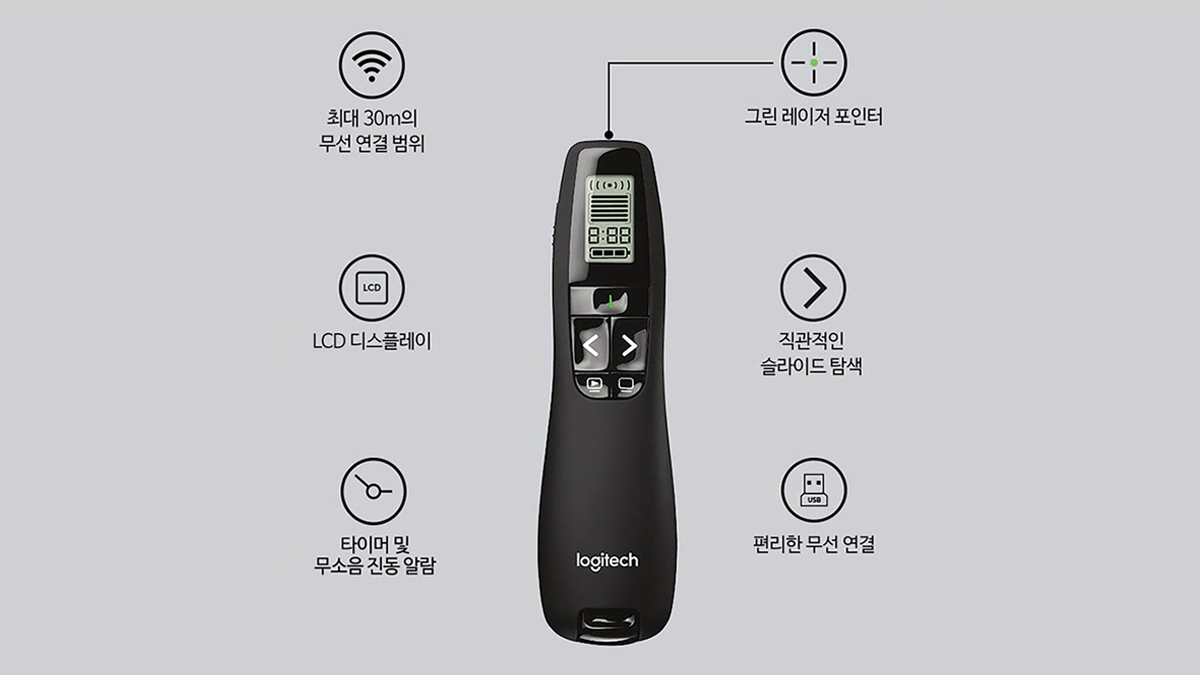 • -프리젠터 설정을 위해 별도의 소프트웨어가 필요합니다. http://support.logitech.com/ko_kr/software/logi-presentation에서 다운로드하세요.