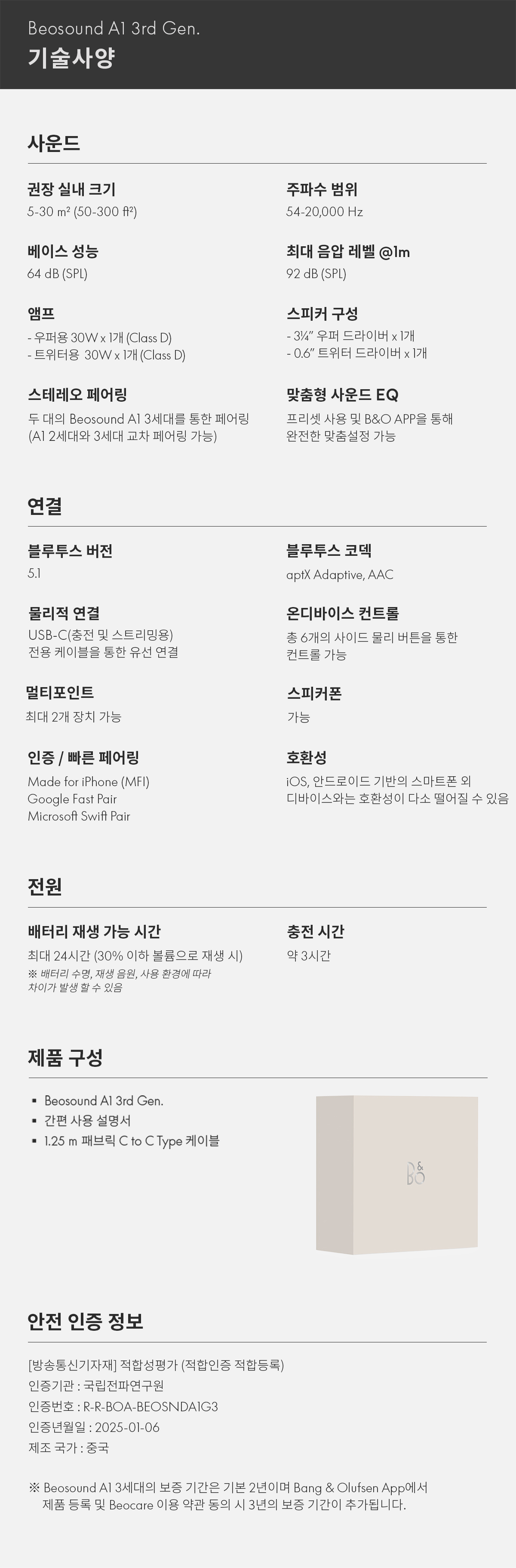 | 구성 | Beosound A1 3th, 1.25m 케이블(C to C type), 사용 설명서 |